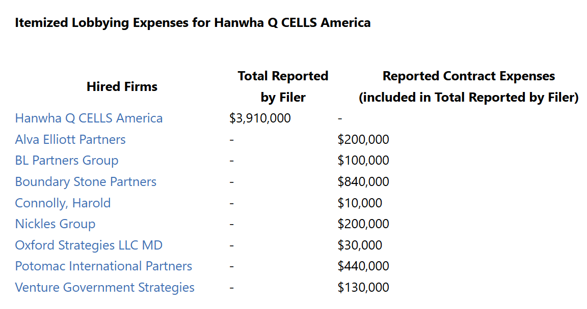2024年一年,韩华在美国设立的专门游说公司Q CELLS总共花掉了将近400万美元,主要流向除了国防拨款、预算之外,在商贸、国土安全等方面也有投入。可以说,在美国“入乡随俗”方面,韩华做得非常专业。